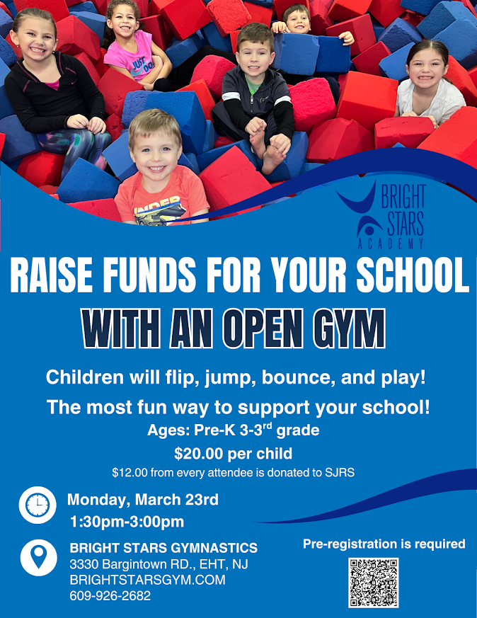 Keep the kids busy while we are closed! Mon, March 23rd from 1:30-3pm at Bright Stars Gymnasium in Egg Harbor Township. Raise funds for SJRS with an open gym where children will flip, jump, bounce, and play. Ages: PK3 to 3rd Grade, $20 per child and $12 from every attendee is donated back to SJRS. Pre-registration is required by March 20th.